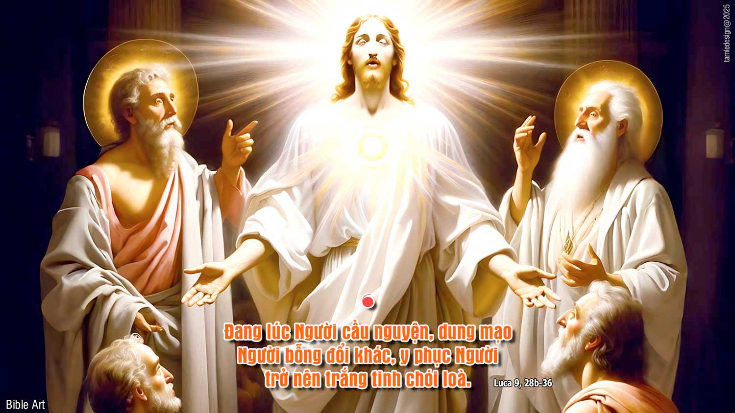 Khi ấy, Đức Giê-su lên núi cầu nguyện đem theo các ông Phê-rô, Gio-an và Gia-cô-bê. Đang lúc Người cầu nguyện, dung mạo Người bỗng đổi khác, y phục Người trở nên trắng tinh chói loà. Và kìa, có hai nhân vật đàm đạo với Người, đó là ông Mô-sê và ông Ê-li-a. Hai vị hiện ra, rạng ngời vinh hiển, và nói về cuộc xuất hành Người sắp hoàn thành tại Giê-ru-sa-lem. Còn ông Phê-rô và đồng bạn thì ngủ mê mệt, nhưng khi tỉnh hẳn, các ông nhìn thấy vinh quang của Đức Giê-su, và hai nhân vật đứng bên Người. Đang lúc hai vị này từ biệt Đức Giê-su p, ông Phê-rô thưa với Người rằng: “Thưa Thầy, chúng con ở đây, thật là hay! Chúng con xin dựng ba cái lều, một cho Thầy, một cho ông Mô-sê, và một cho ông Ê-li-a.” Ông không biết mình đang nói gì. Ông còn đang nói, thì bỗng có một đám mây bao phủ các ông. Khi thấy mình vào trong đám mây, các ông hoảng sợ. Và từ đám mây có tiếng phán rằng: “Đây là Con Ta, người đã được Ta tuyển chọn, hãy vâng nghe lời Người!” Tiếng phán vừa dứt, thì chỉ còn thấy một mình Đức Giê-su. Còn các môn đệ thì nín thinh, và trong những ngày ấy, các ông không kể lại cho ai biết gì cả về những điều mình đã thấy. Ðó là lời Chúa.