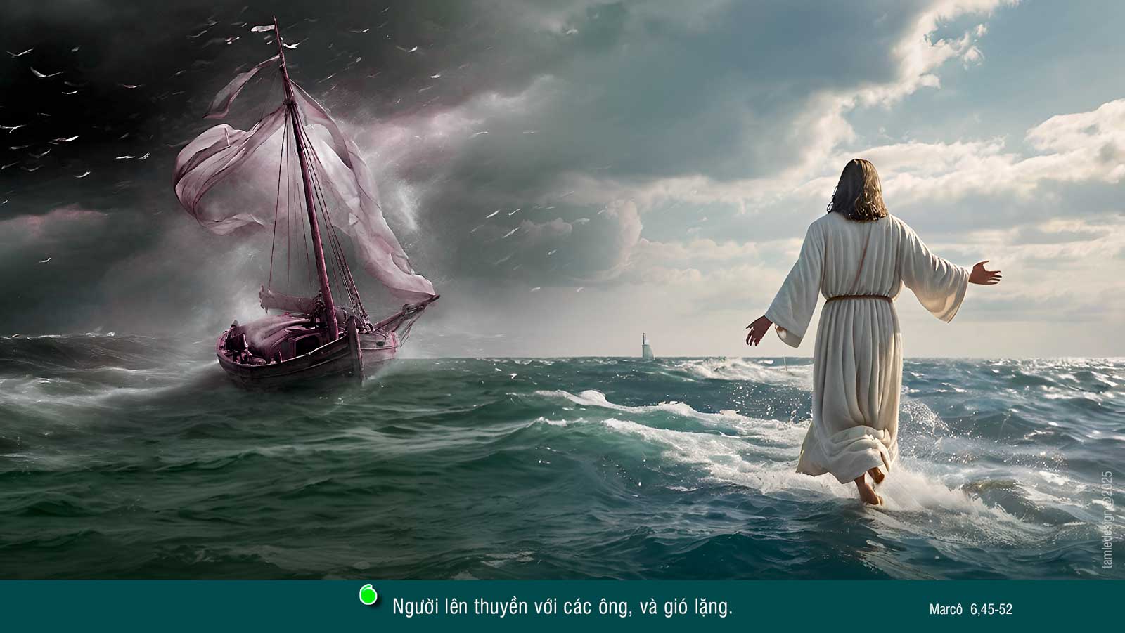 Sau khi cho năm ngàn người được ăn no nê, lập tức, Đức Giê-su bắt các môn đệ xuống thuyền qua bờ bên kia trước, về phía thành Bét-xai-đa, trong lúc Người giải tán đám đông. Sau khi cho họ đi, Người lên núi cầu nguyện. Chiều đến, chiếc thuyền đang ở giữa biển hồ, chỉ còn một mình Người ở trên đất. Người thấy các ông phải vất vả chèo chống vì gió ngược, nên vào khoảng canh tư đêm ấy, Người đi trên mặt biển mà đến với các ông và Người định vượt các ông. Nhưng khi các ông thấy Người đi trên mặt biển, lại tưởng là ma, thì la lên. Quả thế, tất cả các ông đều nhìn thấy Người và đều hoảng hốt. Lập tức, Người bảo các ông: “Cứ yên tâm, chính Thầy đây, đừng sợ!” Người lên thuyền với các ông, và gió lặng. Các ông cảm thấy bàng hoàng sửng sốt, vì các ông đã không hiểu ý nghĩa phép lạ bánh hoá nhiều: lòng trí các ông còn chai đá! Đó là lời Chúa.