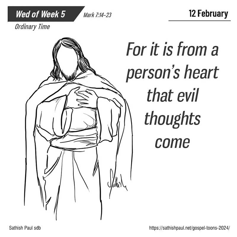 C’est ainsi que Jésus déclarait purs tous les aliments. Il leur dit encore: «Ce qui sort de l’homme, c’est cela qui le rend impur. Car c’est du dedans, du cœur de l’homme, que sortent les pensées perverses: Inconduites, vols, meurtres, adultères, cupidités, méchancetés, fraude, débauche, envie, diffamation, orgueil et démesure. Tout ce mal vient du dedans, et rend l’homme impur.» (Mc 7,14-23)