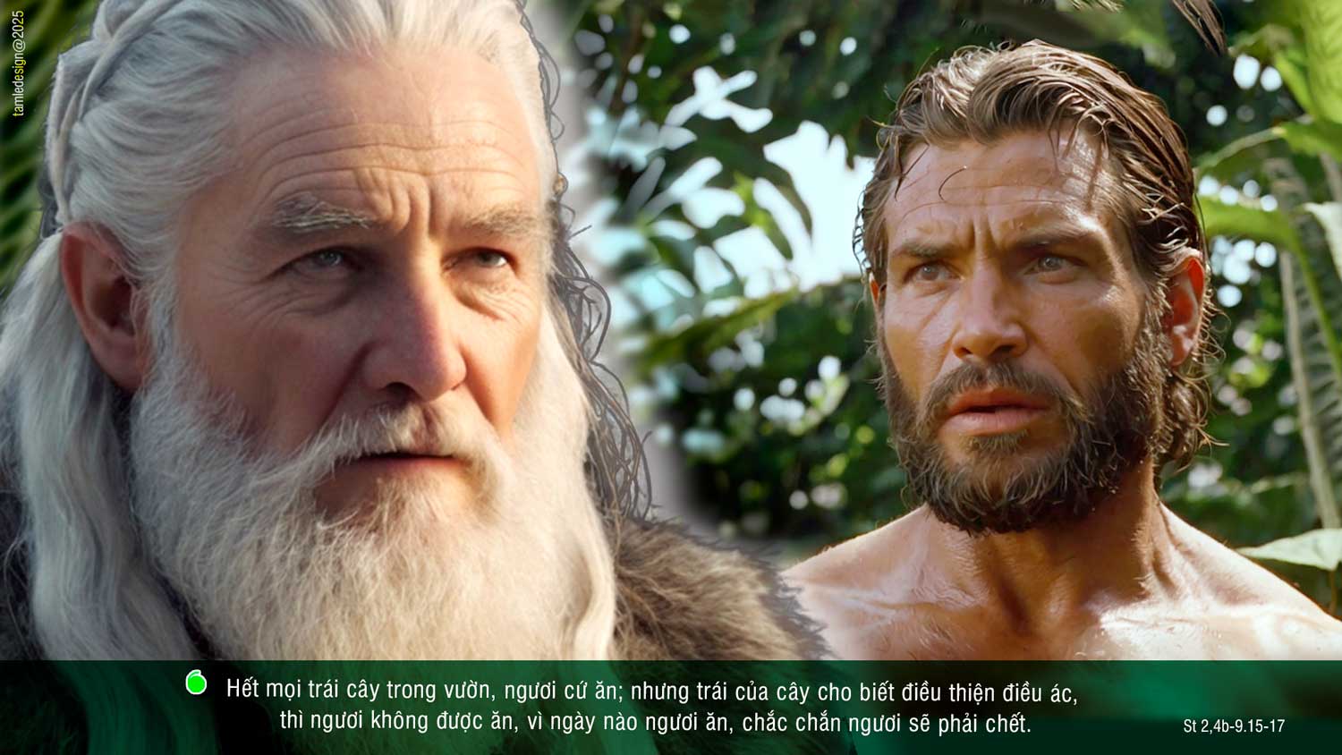 Ngày Đức Chúa là Thiên Chúa làm ra đất và trời, chưa có bụi cây ngoài đồng nào trên mặt đất, chưa có đám cỏ ngoài đồng nào mọc lên, vì Đức Chúa là Thiên Chúa chưa cho mưa xuống đất và không có người để canh tác đất đai. Nhưng có một dòng nước từ đất trào lên và tưới khắp mặt đất. Đức Chúa là Thiên Chúa lấy bụi từ đất nặn ra con người, thổi sinh khí vào lỗ mũi, và con người trở nên một sinh vật. Rồi Đức Chúa là Thiên Chúa trồng một vườn cây ở Ê-đen, về phía đông, và đặt vào đó con người do chính mình nặn ra. Đức Chúa là Thiên Chúa khiến từ đất mọc lên đủ mọi thứ cây trông thì đẹp, ăn thì ngon, với cây trường sinh ở giữa vườn, và cây cho biết điều thiện điều ác. Đức Chúa là Thiên Chúa đem con người đặt vào vườn Ê-đen, để cày cấy và canh giữ đất đai. Đức Chúa là Thiên Chúa truyền lệnh cho con người rằng: “Hết mọi trái cây trong vườn, ngươi cứ ăn; nhưng trái của cây cho biết điều thiện điều ác, thì ngươi không được ăn, vì ngày nào ngươi ăn, chắc chắn ngươi sẽ phải chết.” Đó là lới Chúa.