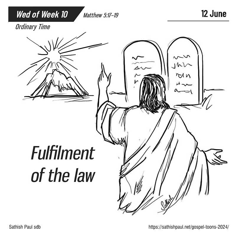 Một hôm, Đức Giê-su nói với các môn đệ rằng: “Anh em đừng tưởng Thầy đến để bãi bỏ Luật Mô-sê hoặc lời các ngôn sứ. Thầy đến không phải là để bãi bỏ, nhưng là để kiện toàn. Vì, Thầy bảo thật anh em, trước khi trời đất qua đi, thì một chấm một phết trong Lề Luật cũng không thể qua đi được, cho đến khi mọi sự được hoàn thành. Vậy ai bãi bỏ dù chỉ là một trong những điều răn nhỏ nhất ấy, và dạy người ta làm như thế, thì sẽ bị gọi là kẻ nhỏ nhất trong Nước Trời. Còn ai tuân hành và dạy làm như thế, thì sẽ được gọi là lớn trong Nước Trời. Đó là lời Chúa.