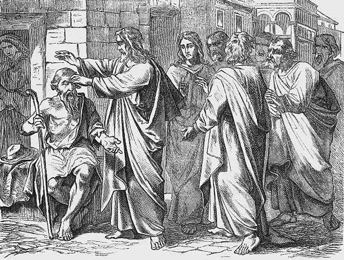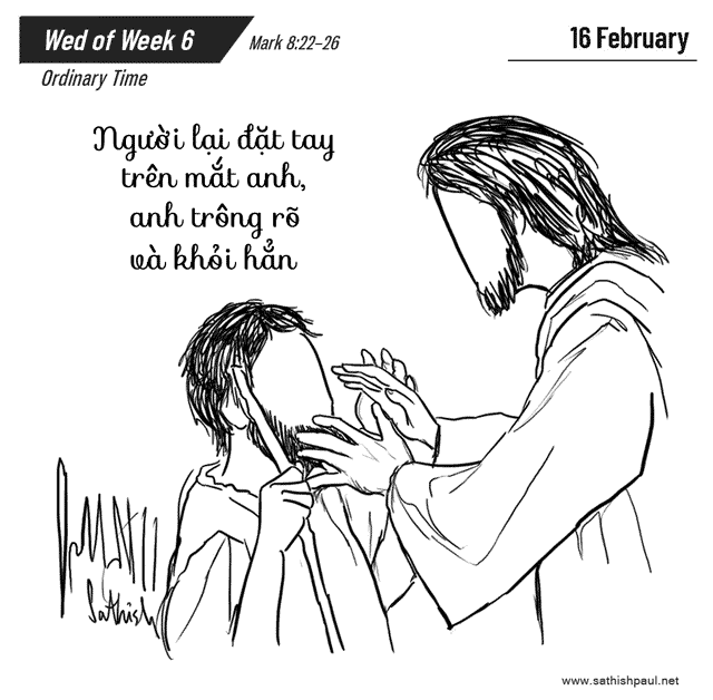 Khi ấy, Đức Giê-su và các môn đệ đến Bết-xai-đa. Người ta dẫn một người mù đến và nài xin Đức Giê-su sờ vào anh ta. Người cầm lấy tay anh mù, đưa ra khỏi làng, rồi nhổ nước miếng vào mắt anh, đặt tay trên anh và hỏi: “Anh có thấy gì không?” Anh ngước mắt lên và thưa: “Tôi thấy người ta, trông họ như cây cối đi đi lại lại.” Rồi Người lại đặt tay trên mắt anh, anh trông rõ và khỏi hẳn; anh thấy tỏ tường mọi sự. Người cho anh về nhà và dặn: “Anh đừng có vào làng.” Đó là lời Chúa.