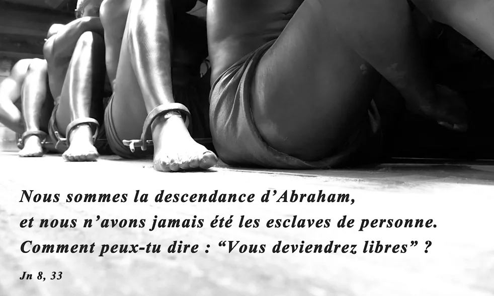 Ils lui répliquèrent: «Nous sommes la descendance d’Abraham, et nous n’avons jamais été les esclaves de personne. Comment peux-tu dire: “Vous deviendrez libres”?» Jésus leur répondit: «Amen, amen, je vous le dis : qui commet le péché est esclave du péché. L’esclave ne demeure pas pour toujours dans la maison; le fils, lui, y demeure pour toujours. Si donc le Fils vous rend libres, réellement vous serez libres. (Jn 8,31-42)