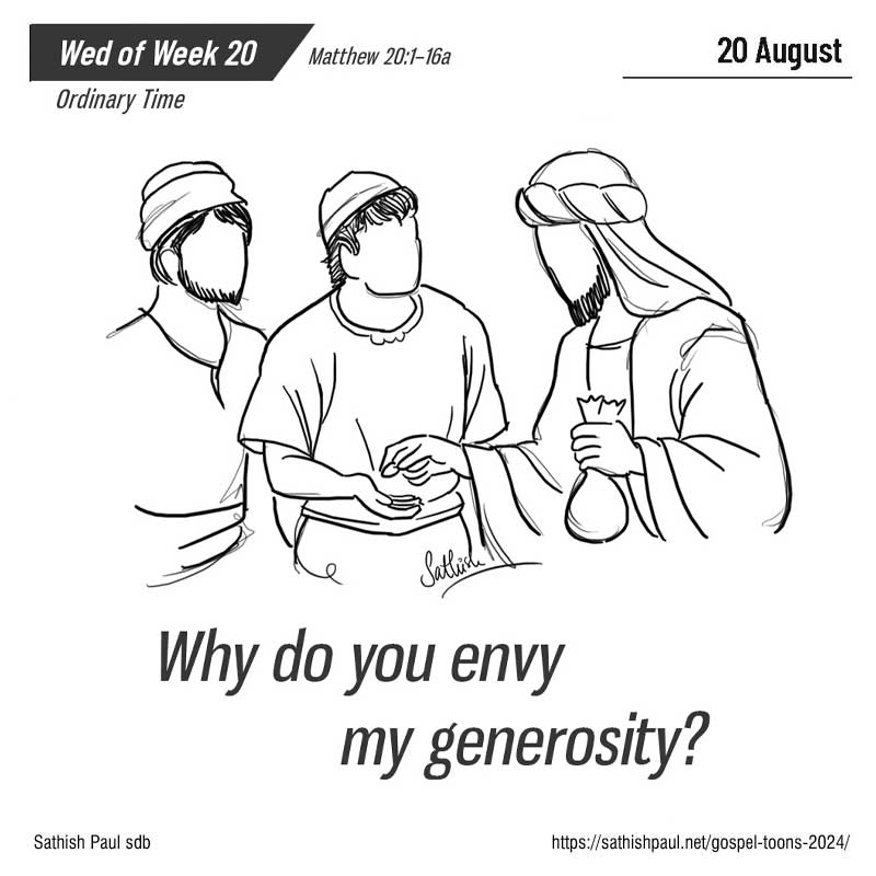 Mais le maître répondit à l’un d’entre eux : “Mon ami, je ne suis pas injuste envers toi. N’as-tu pas été d’accord avec moi pour un denier ? Prends ce qui te revient, et va-t’en. Je veux donner au dernier venu autant qu’à toi : n’ai-je pas le droit de faire ce que je veux de mes biens ? Ou alors ton regard est-il mauvais parce que moi, je suis bon ?” C’est ainsi que les derniers seront premiers, et les premiers seront derniers. » (Mt 20, 1-16)