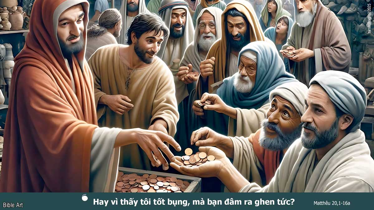 Khi ấy, Đức Giê-su kể cho các môn đệ nghe dụ ngôn này: “Nước Trời giống như chuyện chủ nhà kia, vừa tảng sáng đã ra mướn thợ vào làm việc trong vườn nho của mình. Sau khi đã thoả thuận với thợ là mỗi ngày một quan tiền, ông sai họ vào vườn nho làm việc. Khoảng giờ thứ ba, ông lại trở ra, thấy có những người khác ở không, đang đứng ngoài chợ. Ông cũng bảo họ: “Cả các anh nữa, hãy đi vào vườn nho, tôi sẽ trả cho các anh hợp lẽ công bằng.” Họ liền đi. Khoảng giờ thứ sáu, rồi giờ thứ chín, ông lại trở ra và cũng làm y như vậy. Khoảng giờ mười một, ông trở ra và thấy còn có những người khác đứng đó, ông nói với họ: “Sao các anh đứng đây suốt ngày không làm gì hết?” Họ đáp: “Vì không ai mướn chúng tôi.” Ông bảo họ: “Cả các anh nữa, hãy đi vào vườn nho!” Chiều đến, ông chủ vườn nho bảo người quản lý: “Anh gọi thợ lại mà trả công cho họ, bắt đầu từ những người vào làm sau chót tới những người vào làm trước nhất.” Vậy những người mới vào làm lúc giờ mười một tiến lại, và lãnh được mỗi người một quan tiền. Khi đến lượt những người vào làm trước nhất, họ tưởng sẽ được lãnh nhiều hơn, thế nhưng cũng chỉ lãnh được mỗi người một quan tiền. Họ vừa lãnh vừa cằn nhằn gia chủ: “Mấy người sau chót này chỉ làm có một giờ, thế mà ông lại coi họ ngang hàng với chúng tôi là những người đã phải làm việc nặng nhọc cả ngày, lại còn bị nắng nôi thiêu đốt.” Ông chủ trả lời cho một người trong bọn họ: “Này bạn, tôi đâu có xử bất công với bạn. Bạn đã chẳng thoả thuận với tôi là một quan tiền sao? Cầm lấy phần của bạn mà đi đi. Còn tôi, tôi muốn cho người vào làm sau chót này cũng được bằng bạn đó. Chẳng lẽ tôi lại không có quyền tuỳ ý định đoạt về những gì là của tôi sao? Hay vì thấy tôi tốt bụng, mà bạn đâm ra ghen tức?” Thế là những kẻ đứng chót sẽ được lên hàng đầu, còn những kẻ đứng đầu sẽ phải xuống hàng chót. Đó là lời Chúa.