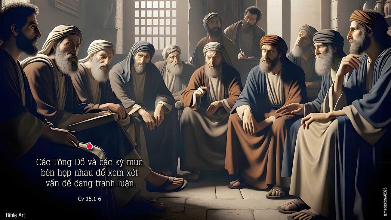 Hồi ấy, có những người từ miền Giu-đê đến An-ti-ô-khi-a dạy anh em rằng: “Nếu anh em không chịu phép cắt bì theo tục lệ Mô-sê, thì anh em không thể được cứu độ.” Ông Phao-lô và ông Ba-na-ba chống đối và tranh luận khá gay go với họ. Người ta bèn quyết định cử ông Phao-lô, ông Ba-na-ba và một vài người khác lên Giê-ru-sa-lem gặp các Tông Đồ và các kỳ mục, để bàn về vấn đề đang tranh luận này. Các ông được Hội Thánh tiễn đưa. Khi đi qua miền Phê-ni-xi và miền Sa-ma-ri, các ông tường thuật việc các dân ngoại đã trở lại với Thiên Chúa, khiến tất cả các anh em rất đỗi vui mừng. Tới Giê-ru-sa-lem, các ông được Hội Thánh, các Tông Đồ và kỳ mục tiếp đón, và các ông kể lại tất cả những gì Thiên Chúa đã cùng làm với các ông. Có những người thuộc phái Pha-ri-sêu đã trở thành tín hữu, bấy giờ đứng ra nói rằng: “Phải làm phép cắt bì cho người ngoại và truyền cho họ giữ luật Mô-sê.” Các Tông Đồ và các kỳ mục bèn họp nhau để xem xét vụ này. Đó là lời Chúa.
