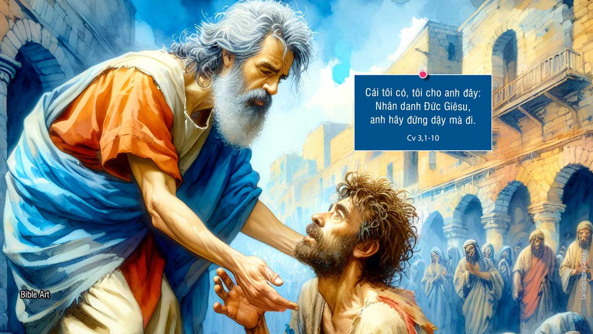 Một hôm, ông Phê-rô và ông Gio-an lên Đền Thờ, vào buổi cầu nguyện giờ thứ chín. Khi ấy, người ta khiêng đến một người què từ khi lọt lòng mẹ. Ngày ngày họ đặt anh ta bên cửa Đền Thờ gọi là Cửa Đẹp, để xin kẻ ra vào Đền Thờ bố thí. Vừa thấy ông Phê-rô và ông Gio-an sắp vào Đền Thờ, anh liền xin bố thí. Ông Phê-rô cùng với ông Gio-an nhìn thẳng vào anh và nói: “Anh nhìn chúng tôi đây!” Anh ta chăm chú nhìn hai ông, tưởng rằng sẽ được cái gì. Bấy giờ ông Phê-rô nói: “Vàng bạc thì tôi không có; nhưng cái tôi có, tôi cho anh đây: nhân danh Đức Giê-su Ki-tô người Na-da-rét, anh đứng dậy mà đi!” Rồi ông nắm chặt lấy tay mặt anh, kéo anh chỗi dậy. Lập tức bàn chân và xương mắt cá của anh trở nên cứng cáp. Anh đứng phắt dậy, đi lại được; rồi cùng với hai ông, anh vào Đền Thờ, vừa đi vừa nhảy nhót và ca tụng Thiên Chúa. Toàn dân thấy anh đi lại và ca tụng Thiên Chúa. Và khi nhận ra anh chính là người vẫn ngồi ăn xin tại Cửa Đẹp Đền Thờ, họ kinh ngạc sững sờ về sự việc mới xảy đến cho anh. Đó là lời Chúa.