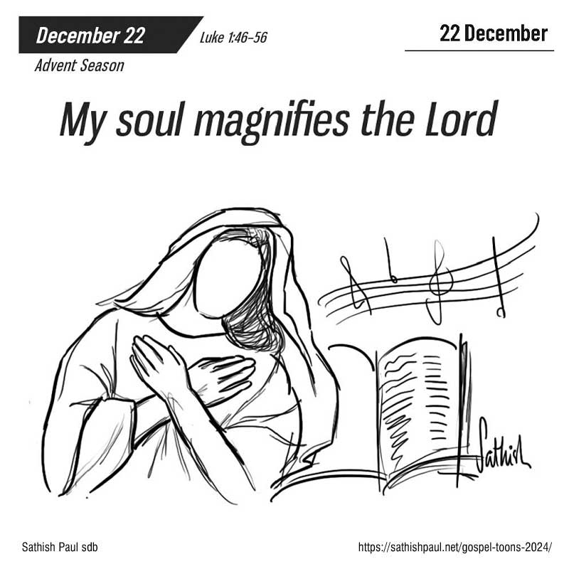 Marie rendit grâce au Seigneur en disant : « Mon âme exalte le Seigneur, exulte mon esprit en Dieu, mon Sauveur ! Il s’est penché sur son humble servante ; désormais tous les âges me diront bienheureuse. Le Puissant fit pour moi des merveilles ; Saint est son nom ! Sa miséricorde s’étend d’âge en âge sur ceux qui le craignent. (Lc 1, 46-56)