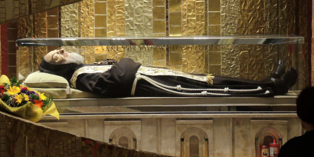 Thi hài Cha Thánh Piô trong quan tài bằng thủy tinh ở San Giovanni Rotondo.