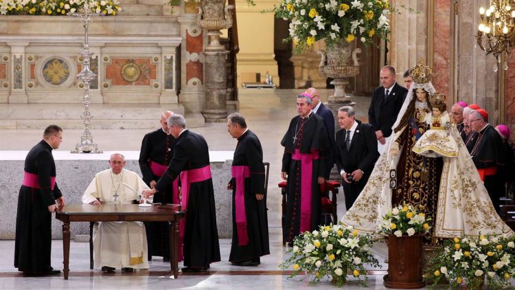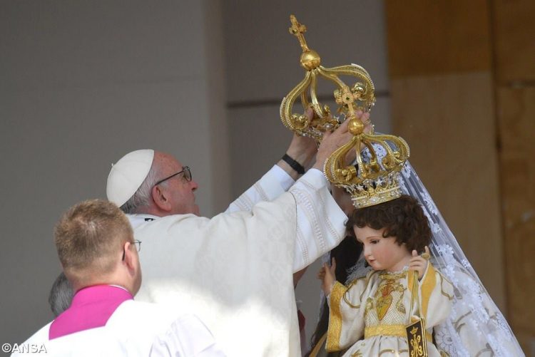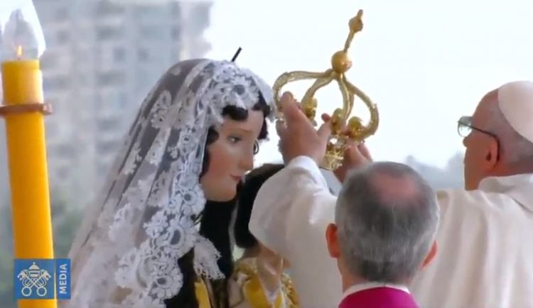 Trong thánh lễ tại đây, sau bài giảng, Đức Phanxicô đã xông hương, rảy nước thánh và đội triều thiên cho tượng Đức Mẹ.