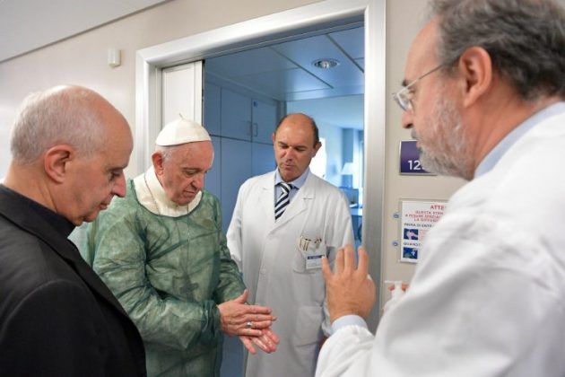 Khoảng 4 giờ chiều, Đức Phanxicô đã làm cho những người có mặt ở bãi đậu xe bệnh viện ngạc nhiên vui mừng. Ngài đến thăm bệnh viện và được nhóm bác sĩ và nhân viên bệnh viện hướng dẫn đi thăm các trại bệnh.