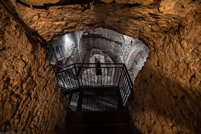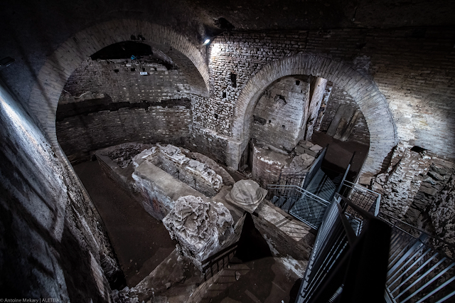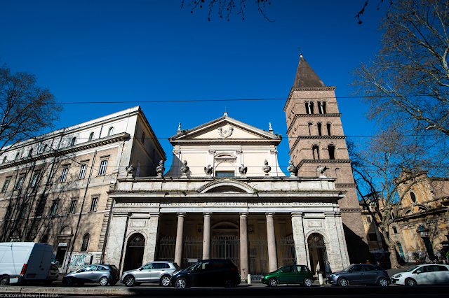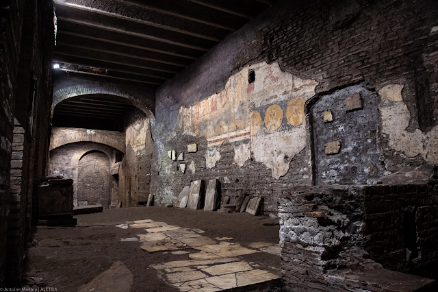 Vương cung thánh đường San Crisogono ở Trastevere (địa điểm khai quật). Cầu thang dẫn xuống nhà thờ nguyên thủy có từ thế kỷ thứ 5. Vương cung thánh đường San Crisogono ở Trastevere thuộc về “Patrimonio del Fondo Edifici Culto – Bộ Nội vụ Ý.”