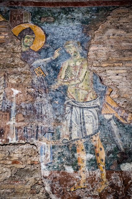 Vương cung thánh đường San Crisogono ở Trastevere (địa điểm khai quật). Bức bích họa các Thánh Chrysogonus, Rufinus và Anastasia ở hành lang giữa của hầm mộ. Vương cung thánh đường San Crisogono ở Trastevere thuộc về “Patrimonio del Fondo Edifici Culto – Bộ Nội vụ Ý.”