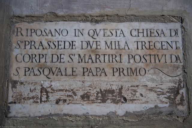 Vương cung thánh đường Santa Prassede. Một tấm bia khắc chữ trên bức tường phía trong của mặt tiền ghi lại chi tiết rằng hài cốt của 2.300 vị tử đạo trong các cuộc bách hại của thế kỷ thứ 2 được chôn cất tại đây; Đức Giáo hoàng Pasqual I đã đưa họ đến vương cung thánh đường này. Vương cung thánh đường Santa Prassede thuộc về “Patrimonio del Fondo Edifici Culto – Bộ Nội vụ Ý.”