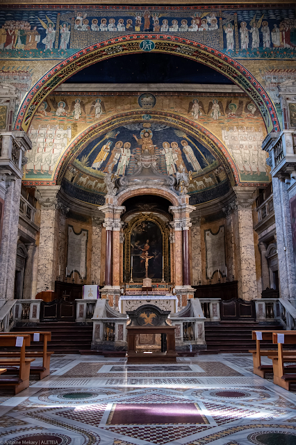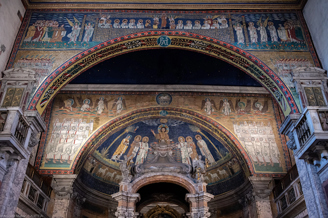 Vương cung thánh đường Santa Prassede (cung thánh). Các bức tranh ghép trên gian cung thánh (thế kỷ thứ 9) mô tả sự tái lâm của Chúa Kitô. Vương cung thánh đường Santa Prassede thuộc về “Patrimonio del Fondo Edifici Culto – Bộ Nội vụ Ý.”
