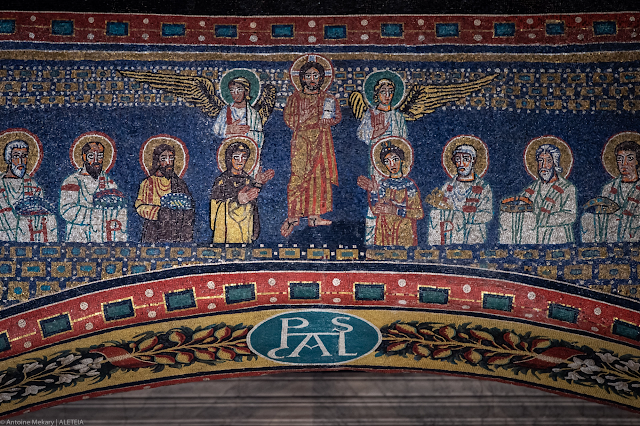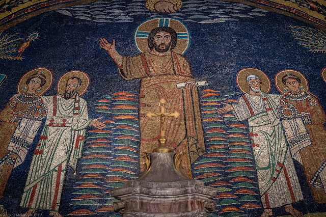 Vương cung thánh đường Santa Prassede. Bức tranh khảm cung thánh (chi tiết). Đức Kitô ở trung tâm của cuộc Tái lâm. Hai bên là Thánh Phêrô cùng với Thánh Pudentiana và Thánh Phaolô với Thánh Praxedes. Vương cung thánh đường Santa Prassede thuộc về “Patrimonio del Fondo Edifici Culto – Bộ Nội vụ Ý.”