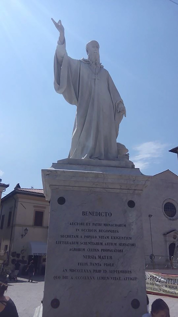 Tượng Thánh Bênêđictô trong quảng trường chính của Norcia.